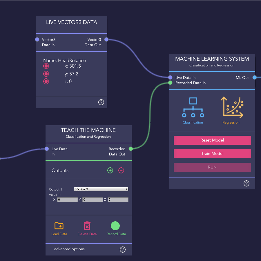 InteractML brings machine learning visual scripting to Unity, empowering game creators to develop novel gameplay mechanics and control schemes without writing code. You can create ML models by joining nodes together and visualize in real-time the data from an Unity scene in the graph.